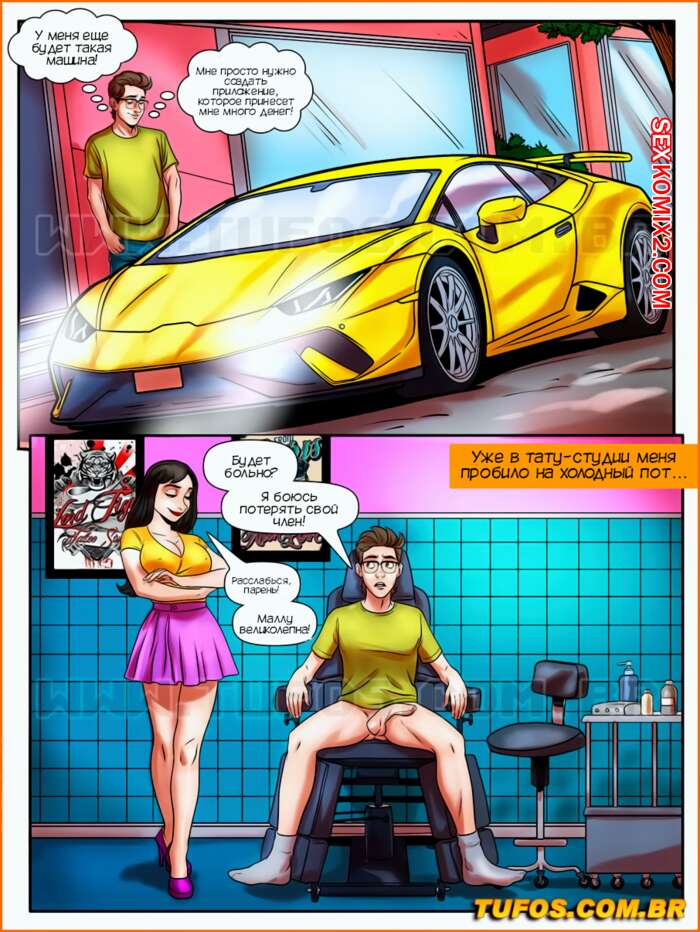 Порно комикс Лакомство заучки. Часть 30. Тату на члене. Tufos Мартин пошел со своей подругой делать татуху на члене. Они закончили дело, после чего красотки решили повеселиться с парнем. Они отсосали его большой хуй, после чего дали ему себя выебать в пизду и задницу.