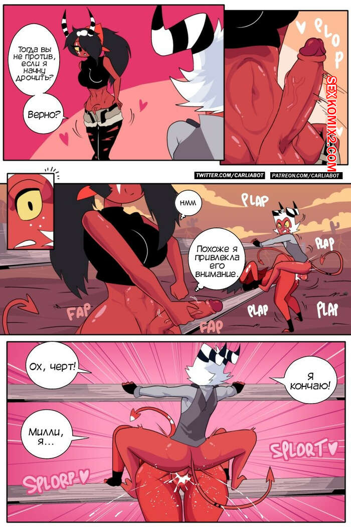 Порно комикс Адский босс. Семейная связь Мокси. Helluva boss. Moxxie family bonding Милли и Мокси вышли на улицу, чтобы расслабиться и потрахаться. Парень стал ебать свою жену сзади, пока их подруга смотрела на них и дрочила свой большой хуй, получая огромное удовольствие.