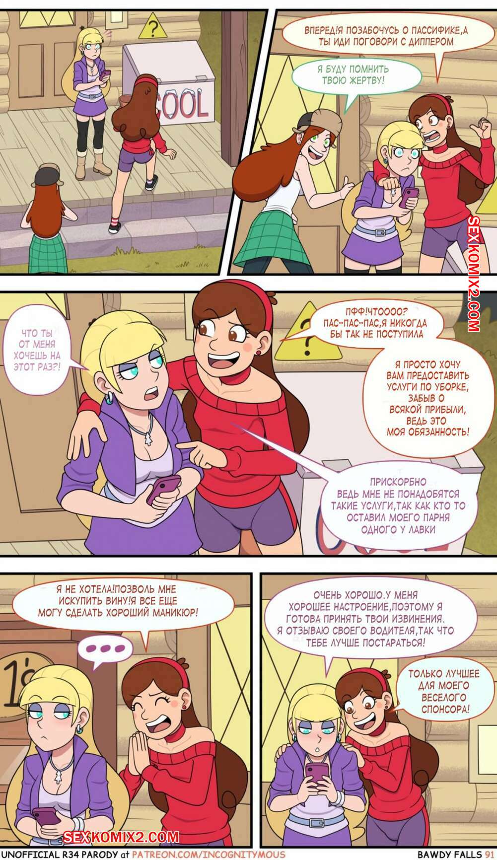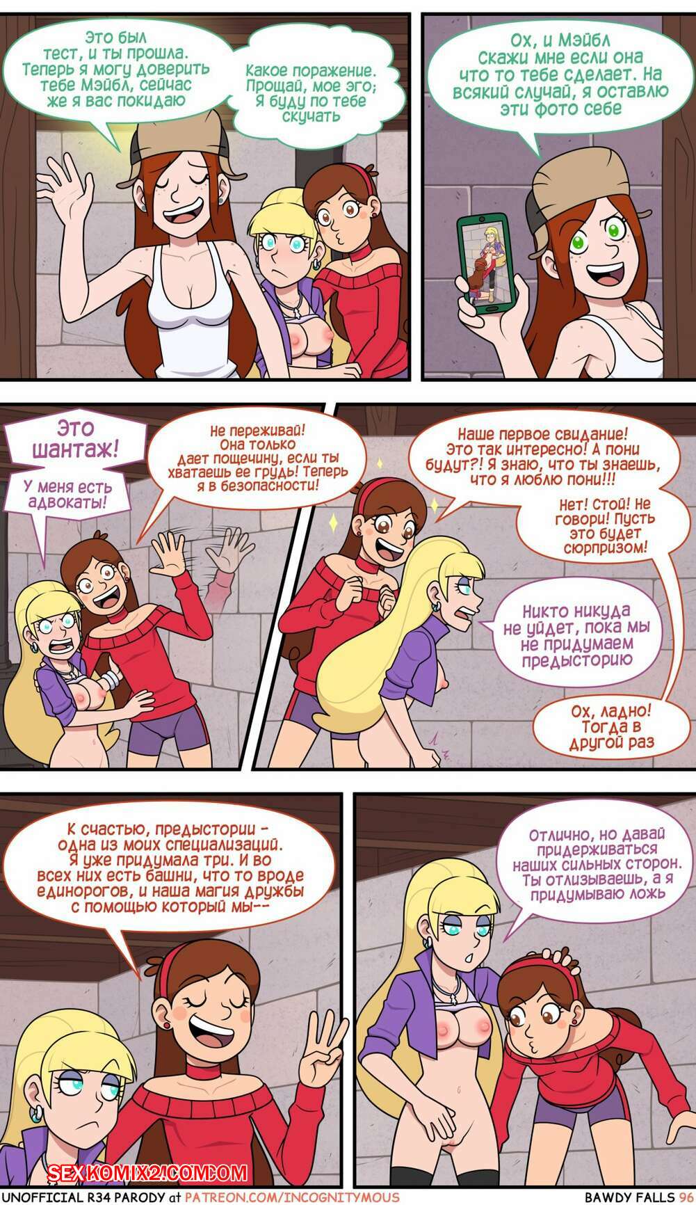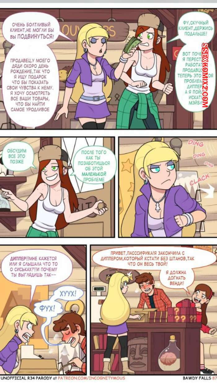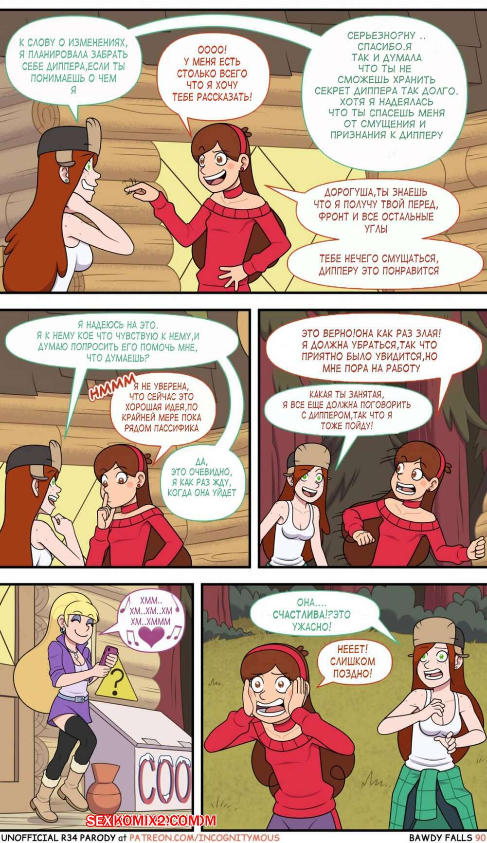 Порно комикс Gravity Falls. Боуди Фолс. Bawdy Falls. Incognitymous Горячие красотки просто без ума от большого члена Диппера. Девушка соблазняют его своими шикарными телами и хорошенько сосут большой хуй парня, после чего он ебет их пизденки.