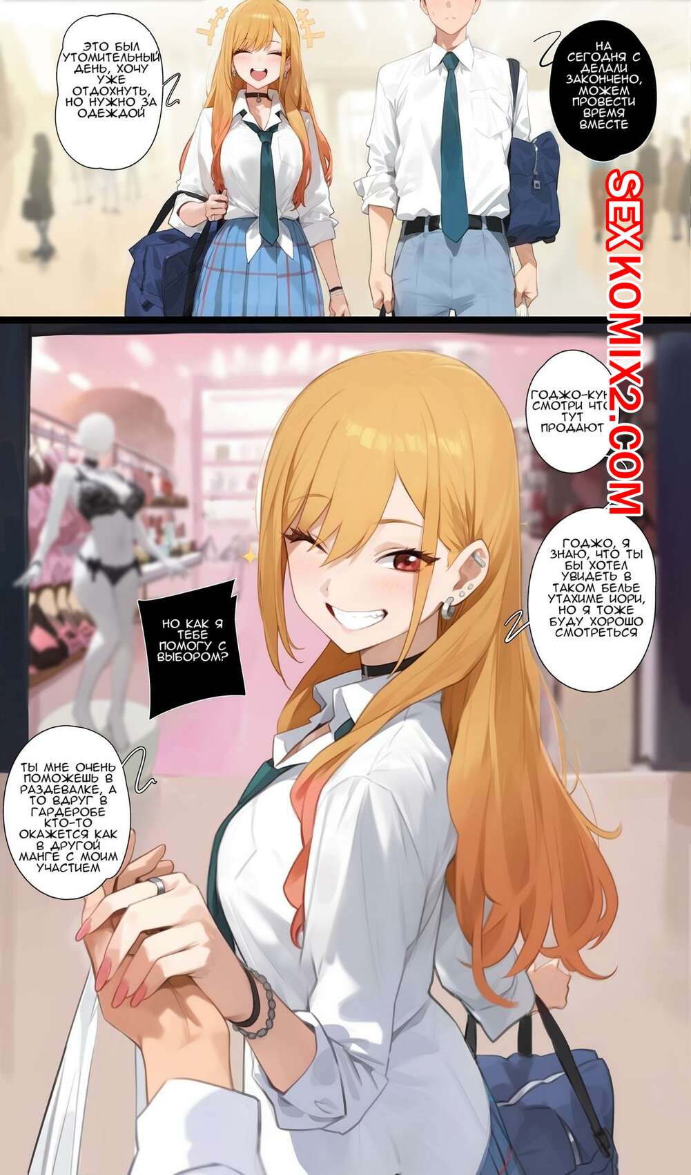 Порно комикс Китагава Марин в гардеробе. Kisou Горячая блондинка пришла в магазин со своим дружком и повела его в примерочную, чтобы повеселиться. Красотка разделась и возбудила парня шикарным телом, после чего дала ему себя выебать.