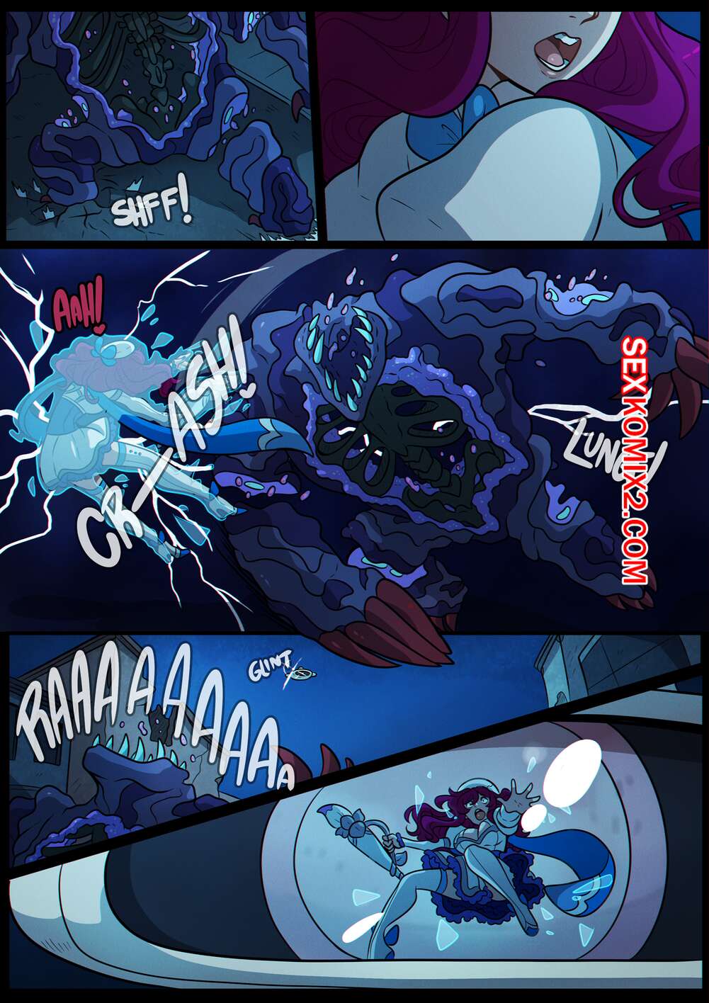 Порно комикс Волшебная мисс Люси. Часть 2.3. Magical Miss Lucy. Kinkymation Красотку Люси схватил огромный монстр и лишил девушку возможности двигаться. Он достал свои щупальцы и стал ебать девушку во все дырочки, но ей удалось вырваться.