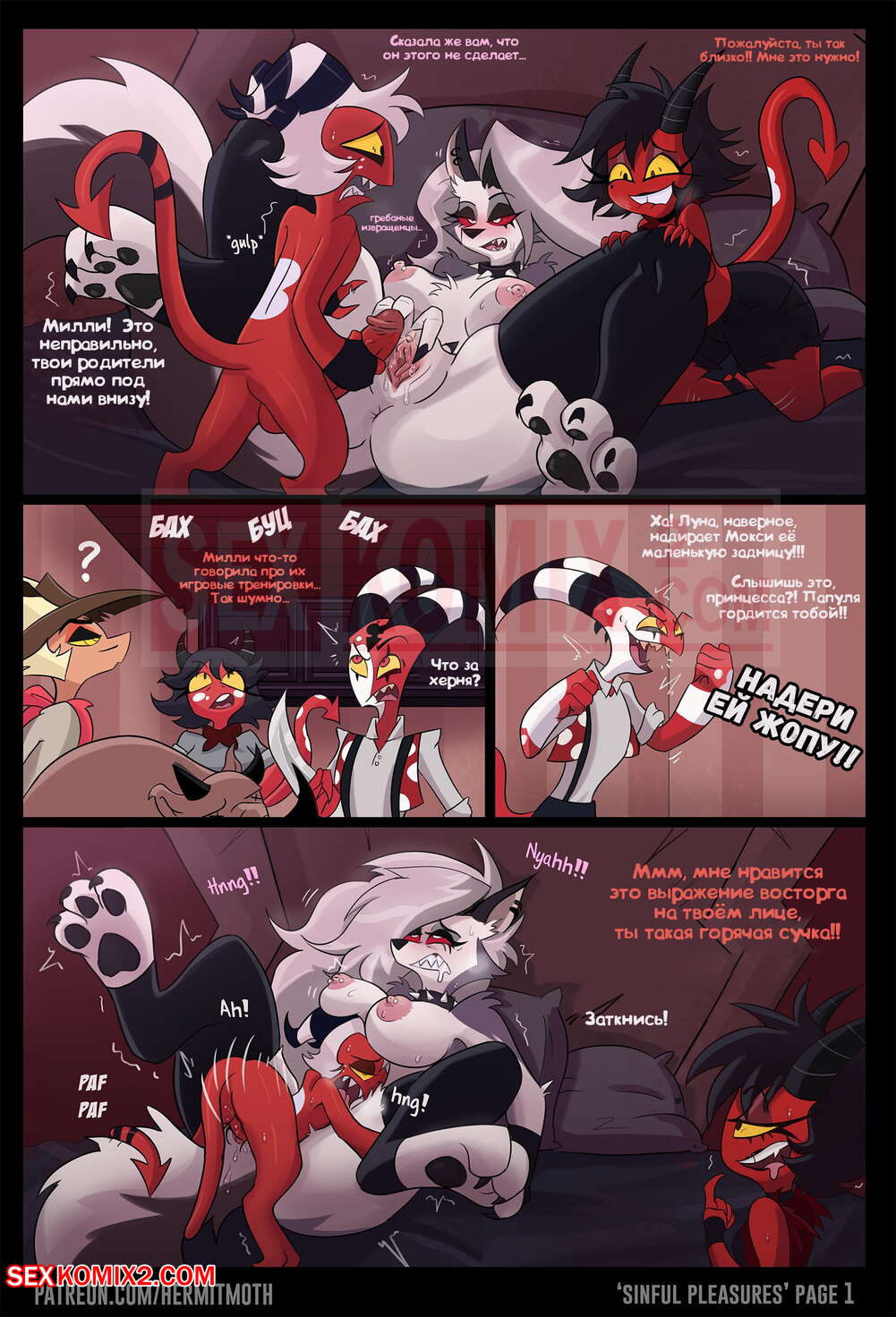 Порно комикс Адский Босс. Греховные удовольствия. Sinful Pleasures. Hermit Moth Парочка демонов очаровала классную шикарную сисястую блондинку. Пока парнишка ебал ее в разных позах, его мадам наблюдала за всем этим со стороны и получала огромное удовольствие.