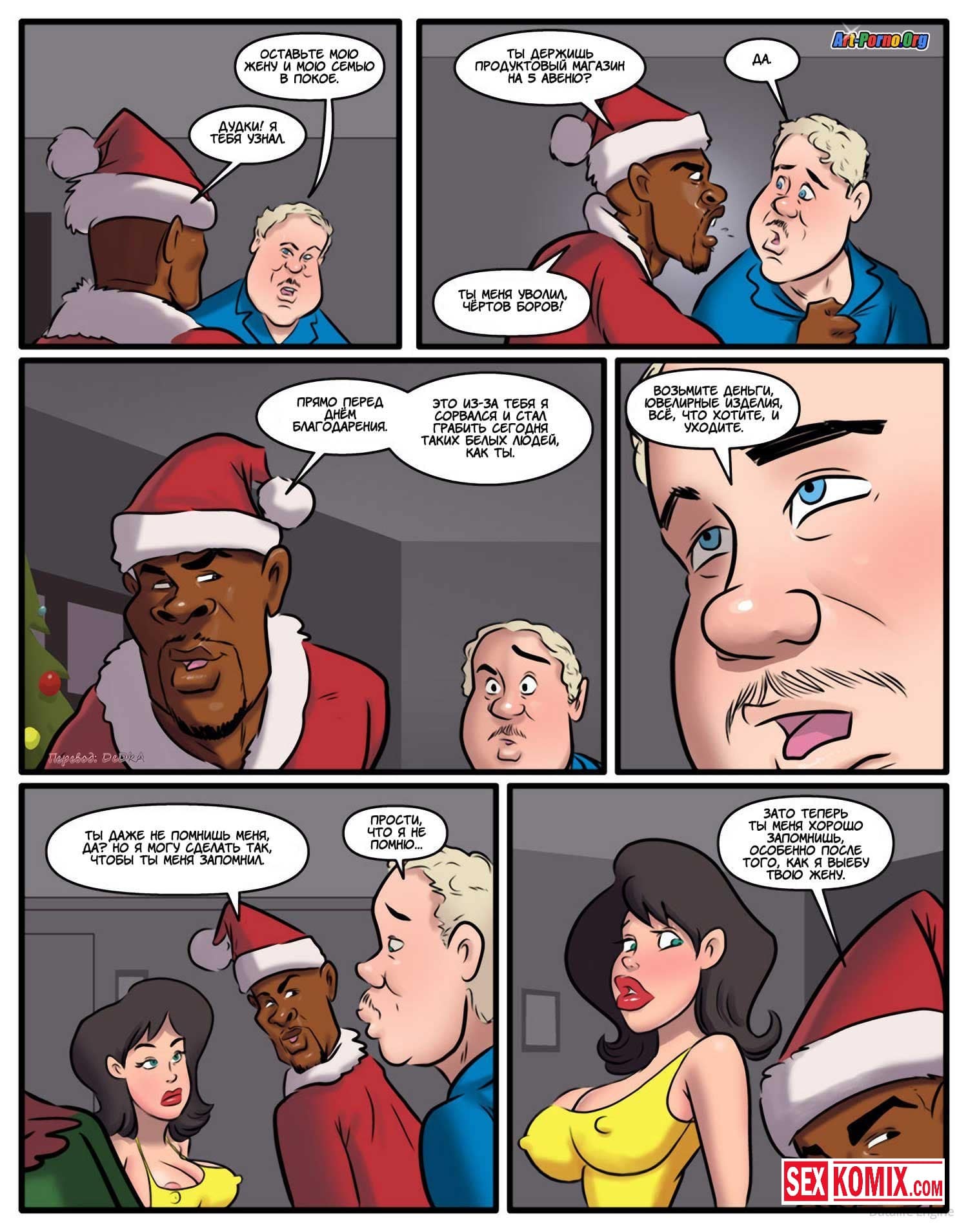 Порно комикс Рождественский бандит. Член вниз. Чернокожий парень ворвался в дом своего бывшего директора, который его уволил перед рождеством. Парень хотел отомстить ему и ничего лучше не придумал, как трахнуть его горячую жену. Он связал мужчину и усадил на стул, что бы он наблюдал как его жена принимает большой член черного преступника. Но женщина не была против, она даже поддавалась ему и получала удовольствие, какого ей не давал муж. И когда всё закончилось, она не хотела отпускать рождественского бандита.