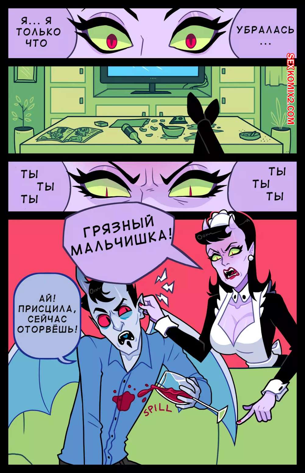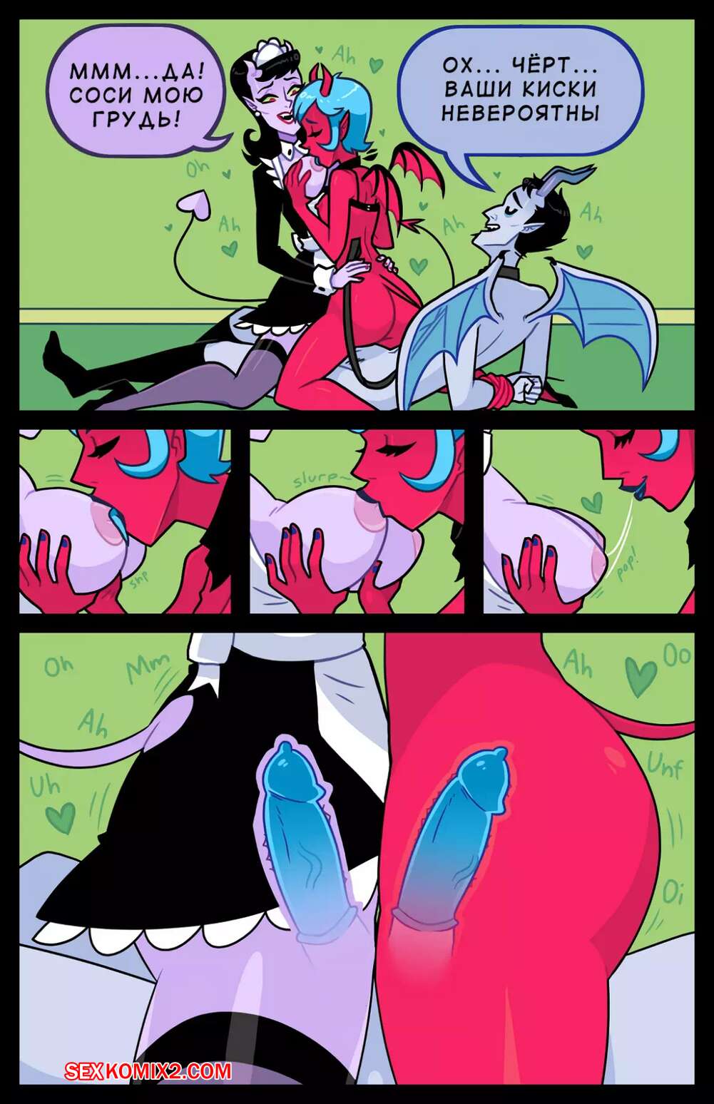 Порно комикс Присцилла повелительница двойного члена Горячая брюнетка горничная решила повеселиться с парнем с двумя хуями. Она раздела его и стала ласкать оба его хуя, а затем к ним присоединилась еще одна девушка и парень выебал их обеих.